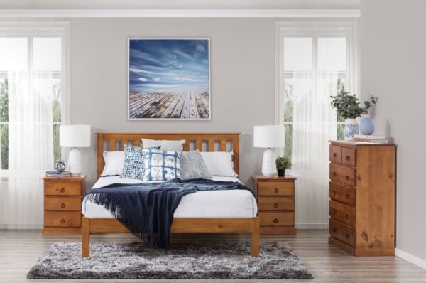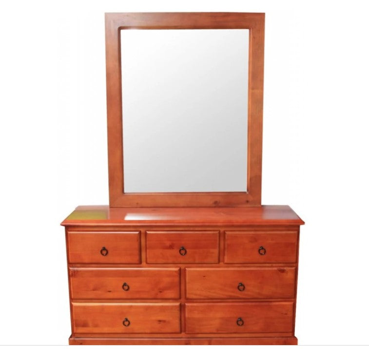 The 5 piece Bedroom suite comprises of Classic Bed Frame, Tallboy, 7 Drawer Dresser with Mirror, and two bedsides.