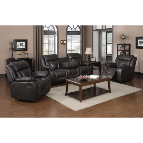 The Hudson Suite includes a sofa and love seat upholstered in rich dark brown bonded leather, thoughtfully designed for maximum comfort. This collection features a sleek, modern look with spacious seating and fully reclining options, ensuring lasting comfort and durability for years of relaxation.