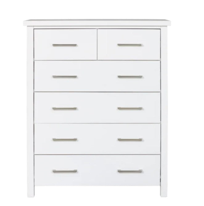 Upgrade your bedroom with the sleek and stylish Master 6 Drawer Tallboy in a modern white finish. Featuring 8 spacious drawers, it provides ample storage to keep your space organized and clutter-free. Its clean, contemporary design ensures it complements any decor while offering practical functionality.