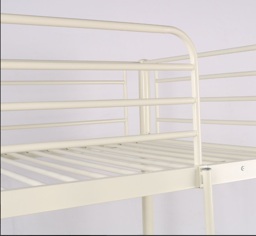 This single-over-single bunk bed features a robust steel frame designed for durability and long-lasting support. The elevated railing height enhances safety during use. Constructed from steel and finished with a white paint coating. Designed to support restful sleep and imaginative play.